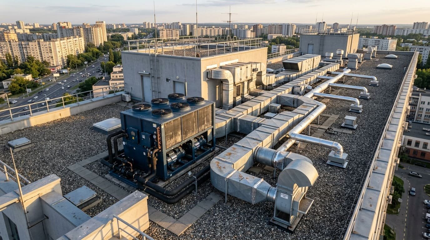 Расчет воздухообмена прост: для воздушных чиллеров Q = P / (1,2 * ρ * ΔT), где P — мощность, ρ — плотность воздуха (1,2 кг/м³), ΔT — перепад температуры 10–15°C. На практике для 200 кВт требуется 20 000 м³/ч. Вентиляционные шахты прокладывают с уклоном 2% для конденсата, используя оцинкованную сталь по ГОСТ 14918-80. В московских ТЦ, таких как Европейский, чиллеры на крыше оснащают рекуператорами тепла для зимнего подогрева.