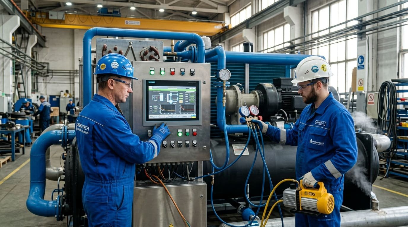 После размещения чиллера пусконаладочные работы (ПНР) подтверждают соответствие нормам. По ПБ 10-574-03, проверяют герметичность контура фреоном R410A или R32, вакуумируют до 500 мкм рт. ст. и заполняют хладагентом. В российских условиях с влажностью 70–90% это критично для предотвращения коррозии. Сертифицированные фирмы вроде Холод-Сервис проводят ПНР за 2–3 дня, фиксируя в акте параметры: давление 25 бар, температура кипения -20°C.